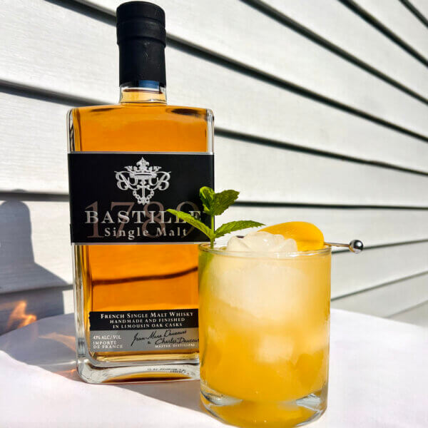 Whisky, mango liqueur, fresh peaches, mint, and lemon. Sweet, slightly boozy, and perfect for sunny weather sipping.