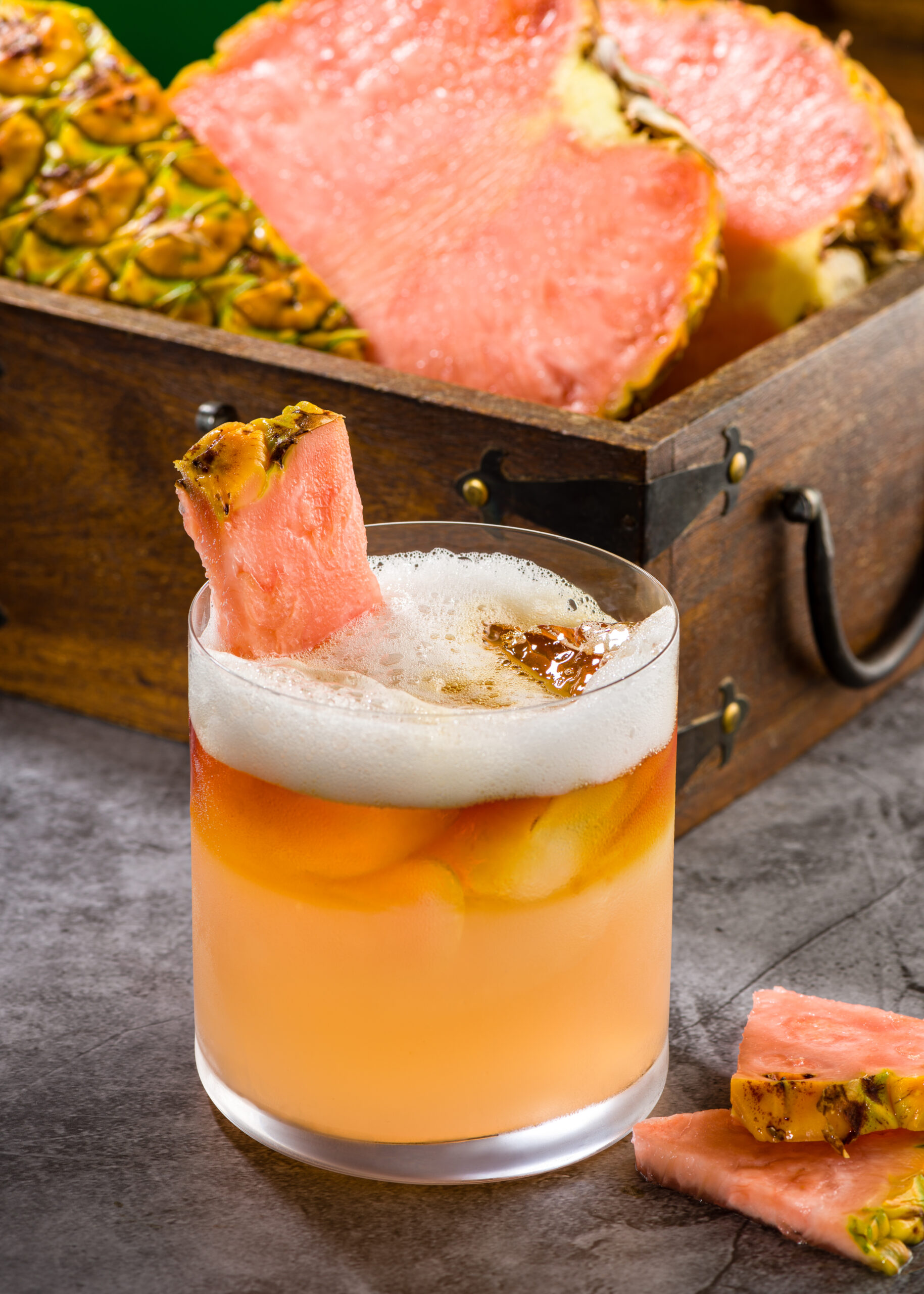 Preparation: Cut Pinkglow® in half. Use a sharp knife to peel the pineapple. Cut around the core to make pineapple wedges and discard the core. Cut the wedges into large chunks. Add the pineapple chunks into a blender and blend until smooth to create a juice. Fill the shaker with ice cubes. Pour in white rum and 8 oz of Pinkglow® juice and shake thoroughly. Pour into each rock glass filled with ice cubes. Top each glass with dark rum on the top to create a layer on top of each cocktail. Add a piece of Pinkglow® as a garnish to each (optional)