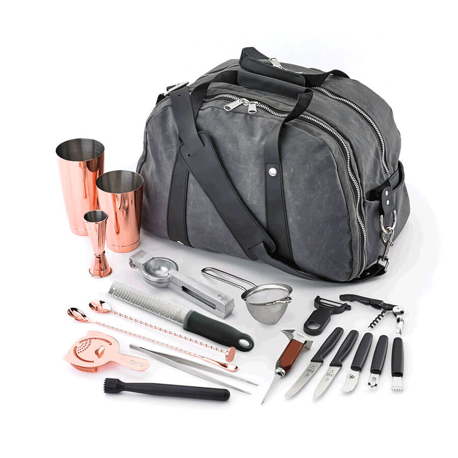 Miami-based bartender Jose Moreno chose the Deluxe II set in a stylish copper finish. The set comes with everything you need to bartend on the go. Whether you want to use your own tools behind the bar, need a kit at home for cocktail competitions, or do traveling work, the complete set and durable carrying bag are a worthwhile investment.