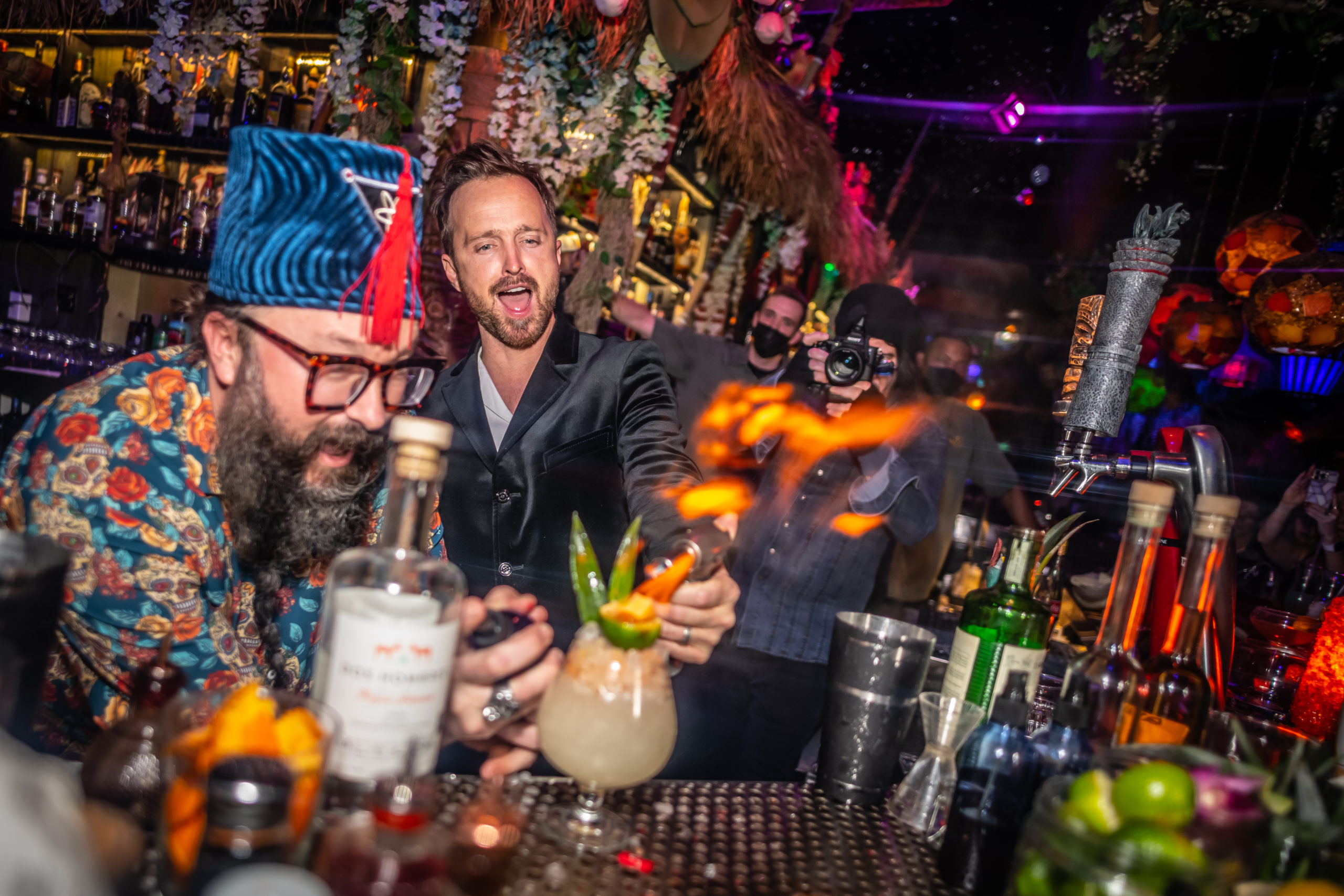 In a fun twist, Paul stepped behind the bar with Rains to shake it up and learn the secrets to setting a drink on fire.