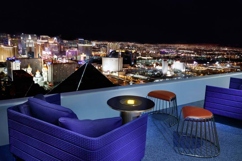 - Skyfall Lounge’s décor simulates the beauty of an evening sunset with deep purple, red and honey gold accents and subtle cloud forms hanging overhead. Every seat in the room delivers optimal views of the sparkling Vegas skyline, while the expansive outdoor patio offers a relaxing, fresh-air escape.