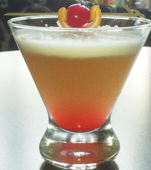 Squeeze two orange slices in the shaker add spices then add all ingredients except grenadine and the whipped cream. Fill the glass full with ice and shake hard for 6 seconds. Strain it in a martini glass add a dash of grenadine to give it color in the bottom. Then float the whipped cream on top. As a garnish use a orange peel with a cherry or a candy crystalized orange peel.
