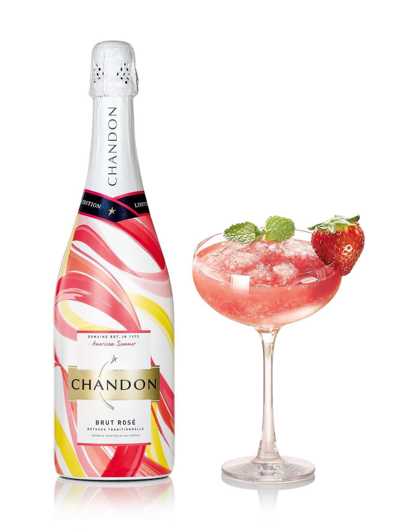 If you’re looking to serve a small crowd, this frozen strawberry delight makes enough for four drinks. Better yet, it gets a patriotic topper with Chandon’s Limited Edition American Summer Rosé.