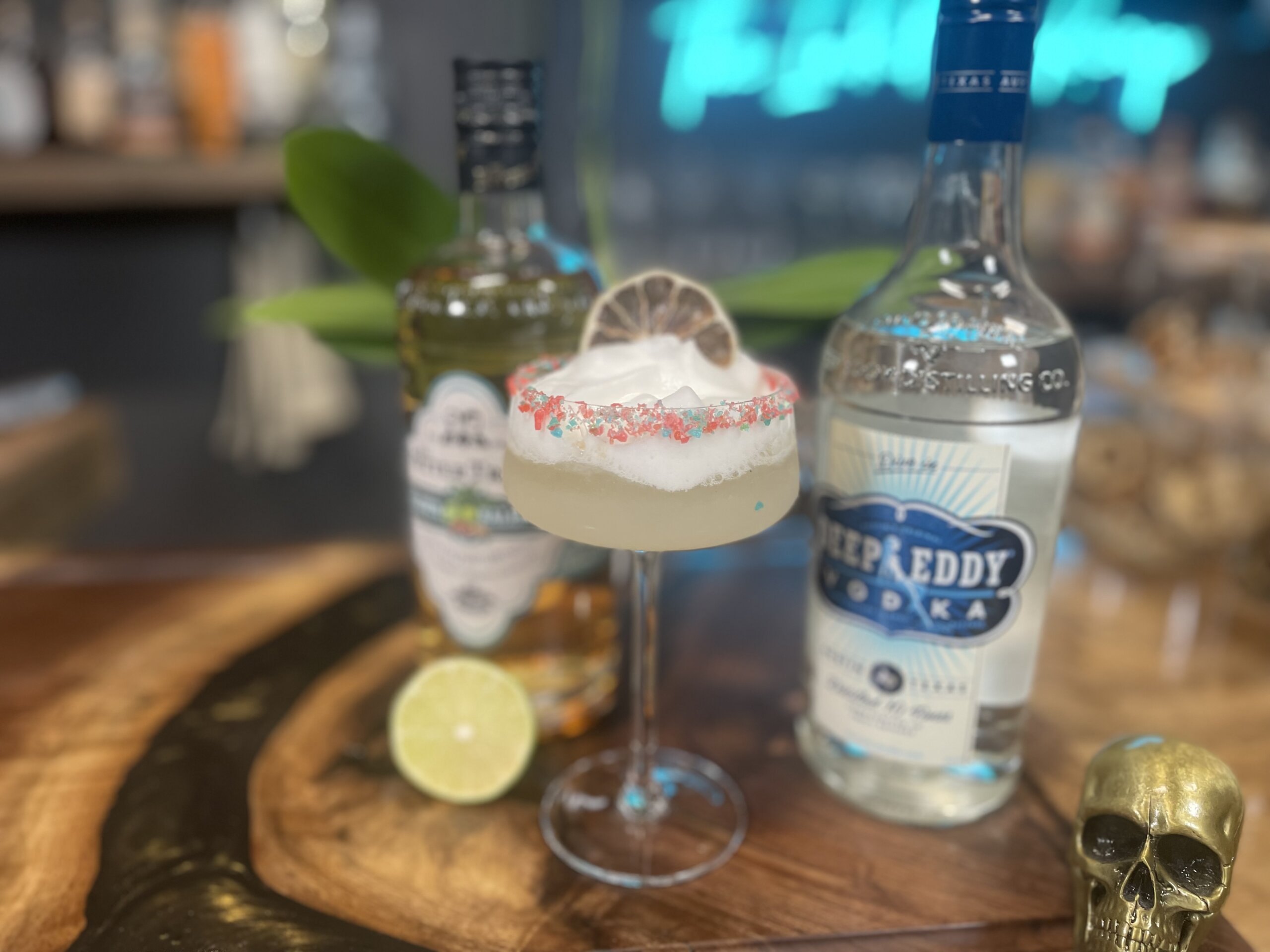 Top with Salted Lime Foam and serve in glass rimmed with pop rocks