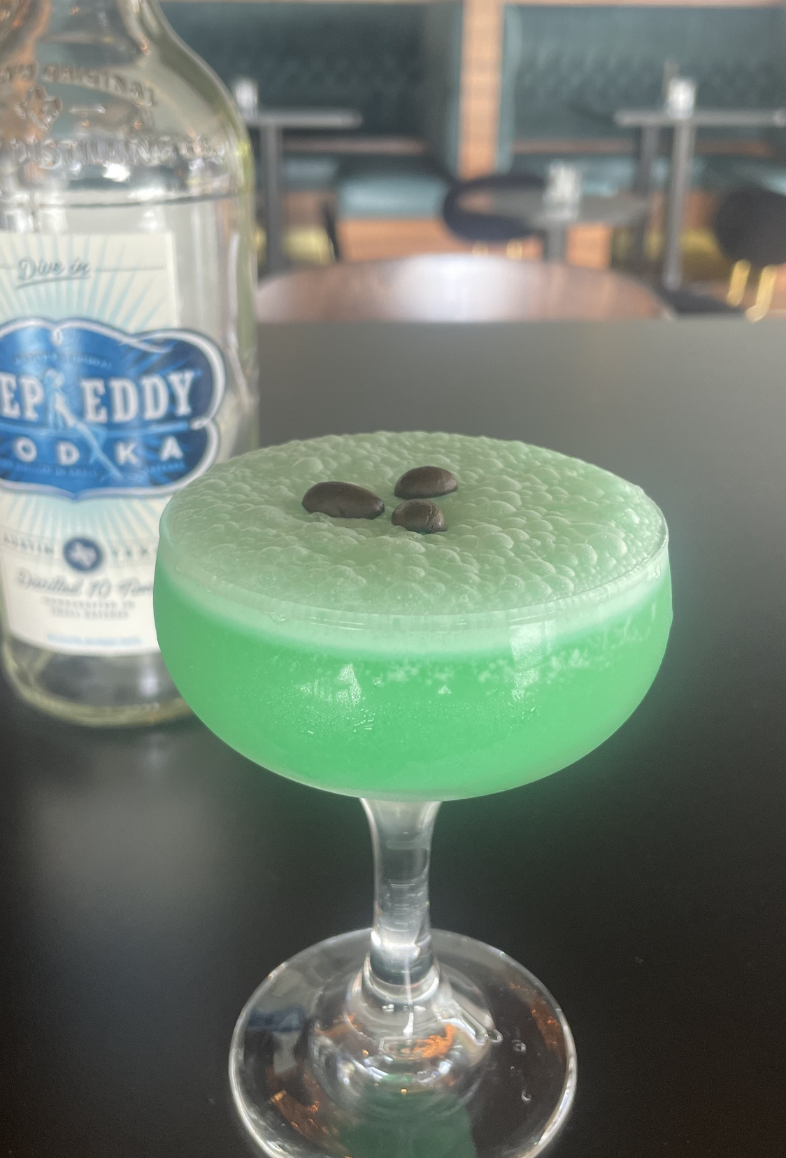1.5 deep Eddie’s vodka, .5 de kuyper crème drink cacao, .5 Hiram walker crème de menthe, .5 coconut macadamia purée, .5 methyl cellulose water, chocolate chips for garnish