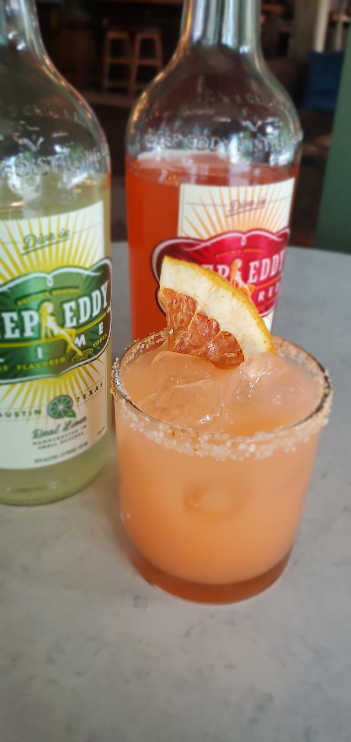 Spin on the greyhound cocktail. With Deep Eddys Texas roots (cowboy) and and a little bit of Caribbean inspiration from the coconut.
