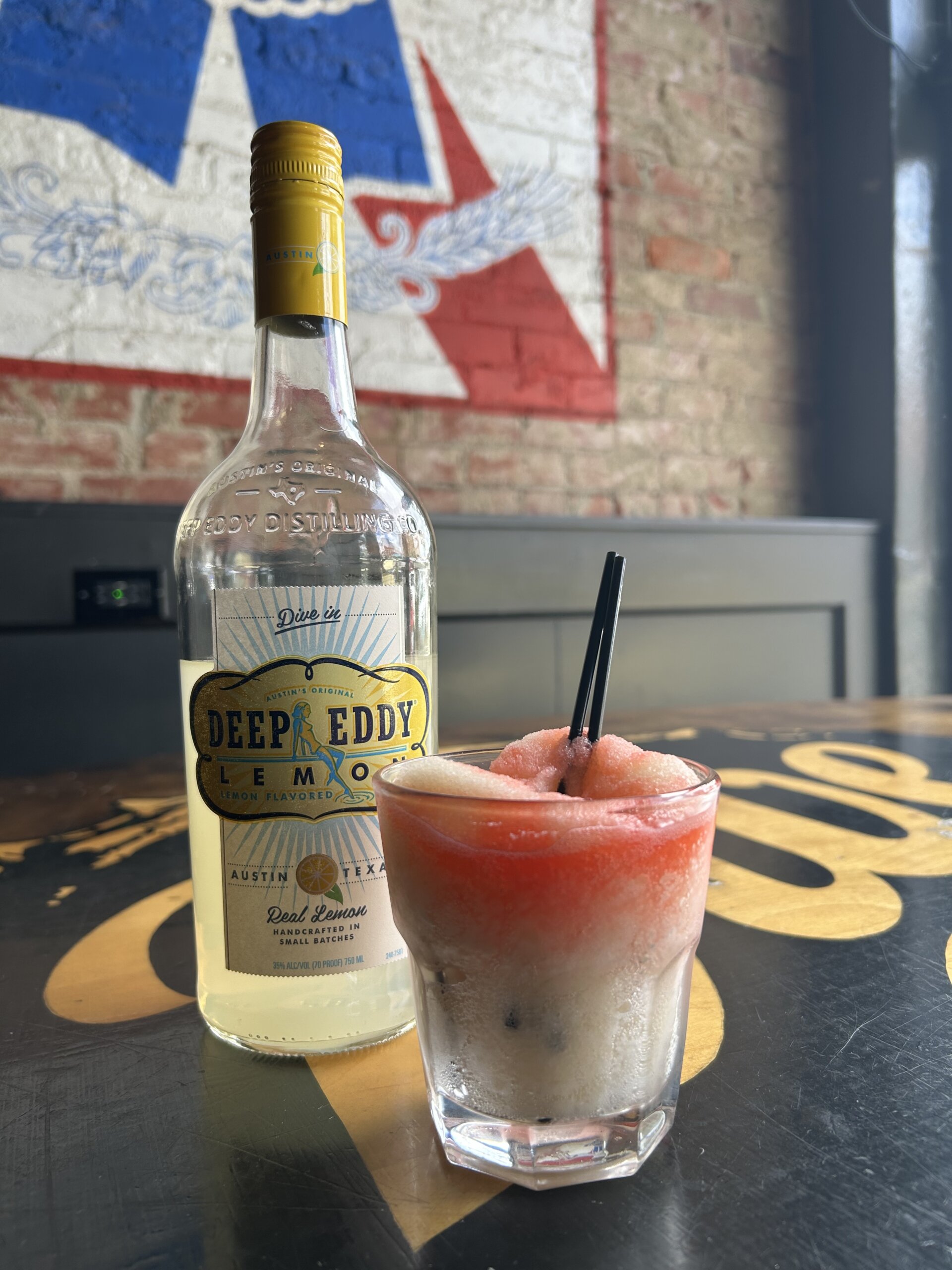 Blend with 1oz champagne, 2 oz lemonade, drizzle blackberry puree