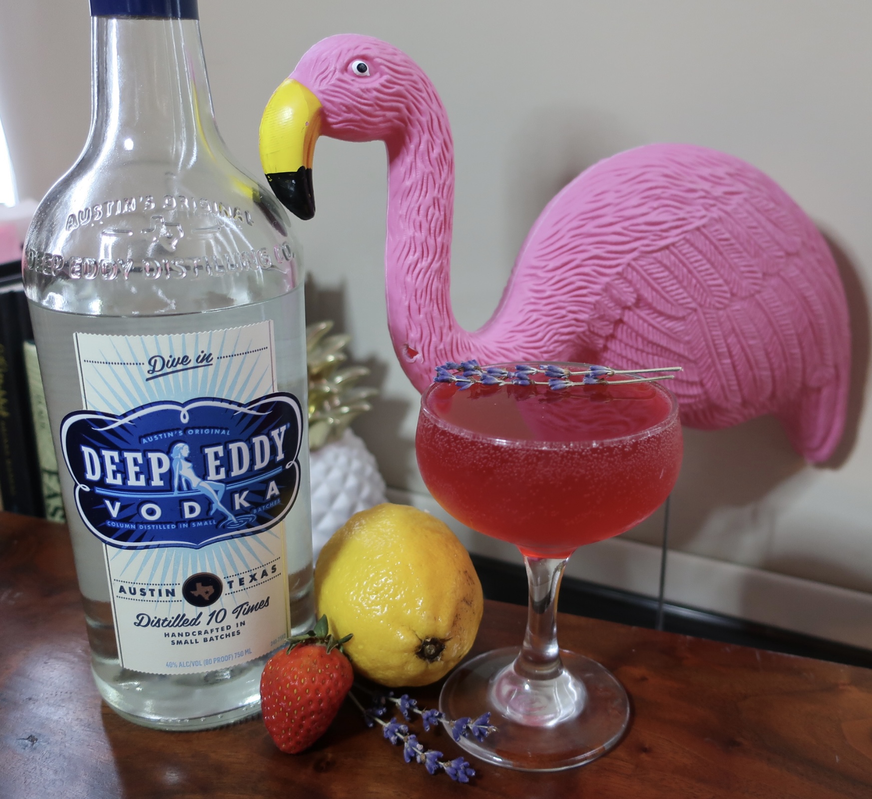 Add 1oz of Deep Eddy Original Vodka, .5oz Strawberry infused Lillet Blanc, .75oz Lavender/Hibiscus simple syrup and .75oz of lemon juice into a shaker tin w/ ice. Shake for 25 seconds. Double strain into a coupe glass and top with 1oz of dry sparkling rosé. Top w/ 2 lavender springs for garnish. [To make the strawberry infused Lillet Blanc fill a quart container with Lillet Blanc and add 5 large chopped up strawberries. Let it infuse for a week (until it turns pink) then strain out the strawberries. To make the lavender hibiscus simple syrup heat up one part white sugar to one part water. Add a quarter part loose lavender and a quarter part dried hibiscus leaves. Heat on a low medium temperature for about 10 minutes stirring occasionally until the syrup is magenta. Let cool. Then strain.]