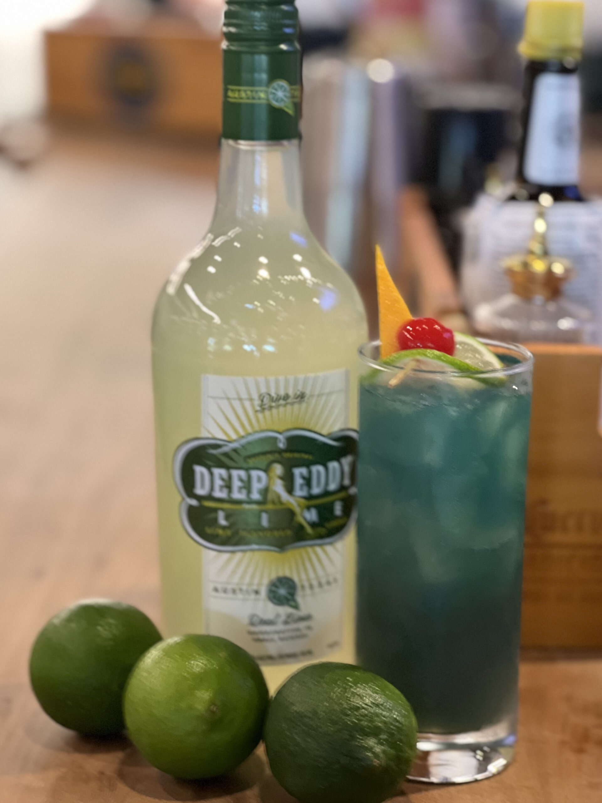 Pour .25oz of grenadine into the bottom of a collins glass, add ice, swirl Deep Eddy Lime and Orange juice together in cup and pour over ice, top with ginger beer. Stir with barspoon to create the “hell fire” effect. Pour blue curacao on top and stir to create the transition from Hell to High Water. Float lime boat garnish on top.