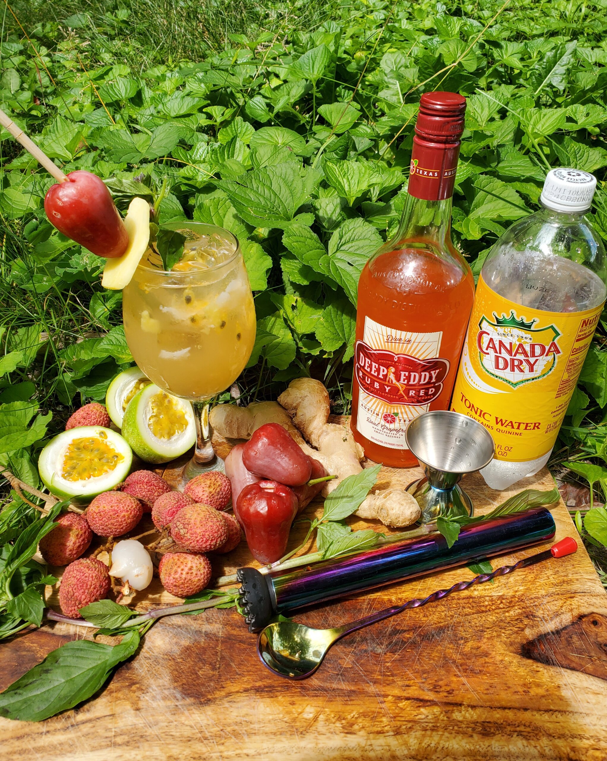Take 1 slice of fresh ginger root and muddle it into the glass. Then muddle one Lychee and a teaspoon of fresh Passion fruit.