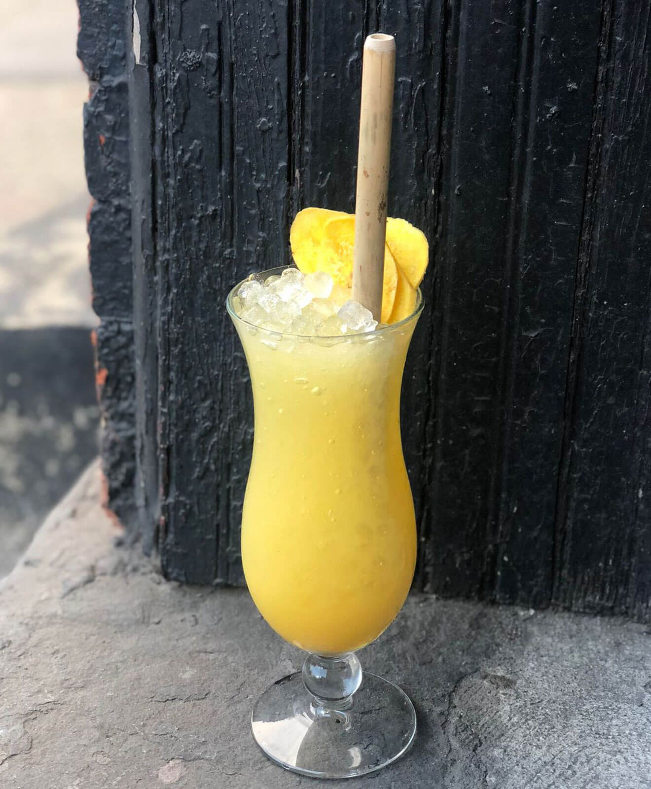 Preparation: Combine ingredients and shake with a few pieces of pebble or cracked ice. Pour into glass and fill with more crushed ice. Garnish with dehydrated banana chips.