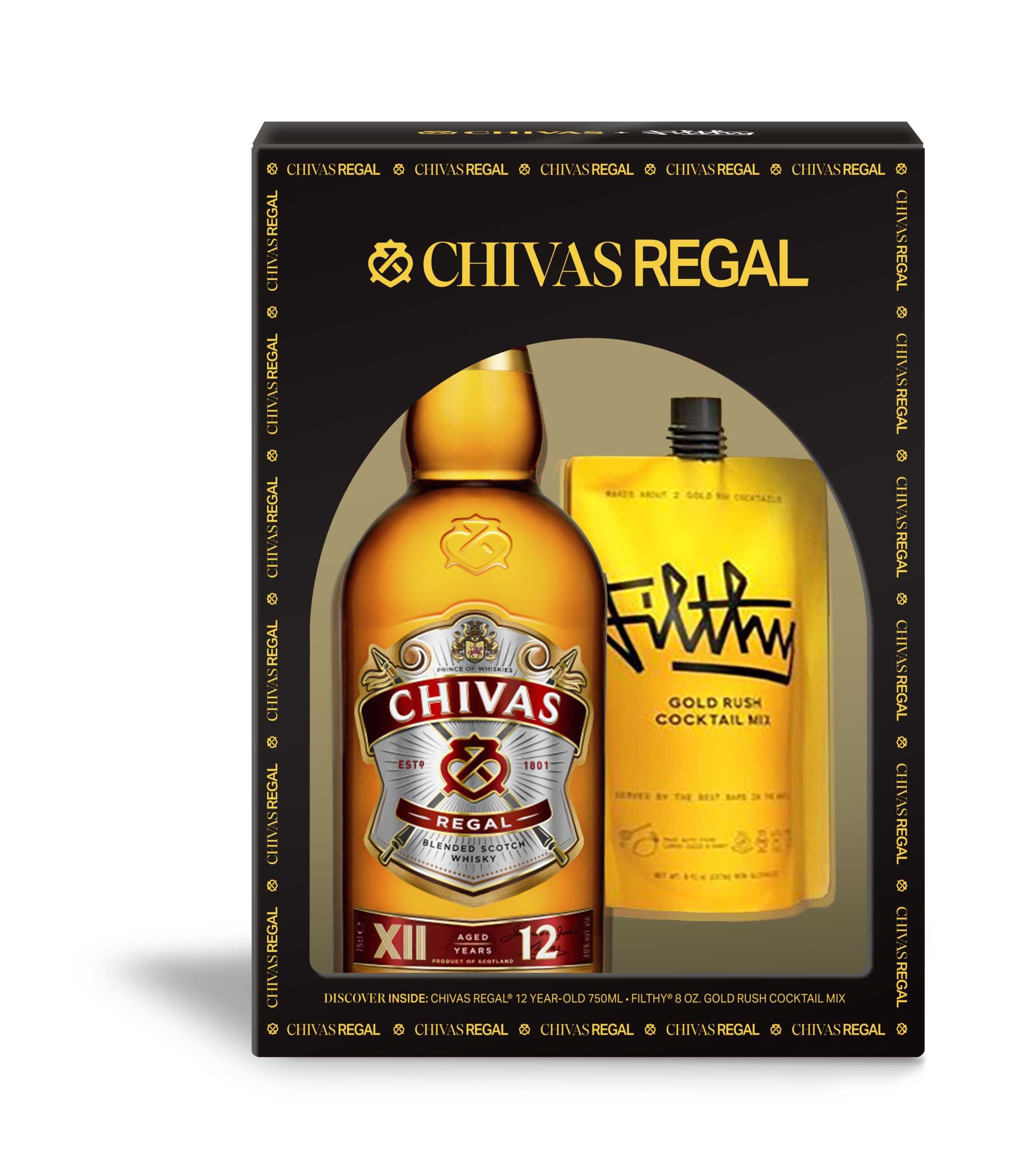 The Chivas Regal x Filthy Gold Rush Cocktail Kit is designed to serve up more golden moments in seconds this holiday season! Representing the signature Chivas Regal style, the VAP includes a 750ml bottle of Chivas 12-Year-Old Scotch, alongside a custom Gold Rush premium cocktail mixer from Filthy Food, packaged in a sustainable pouch and made with the highest quality, carefully sourced ingredients.