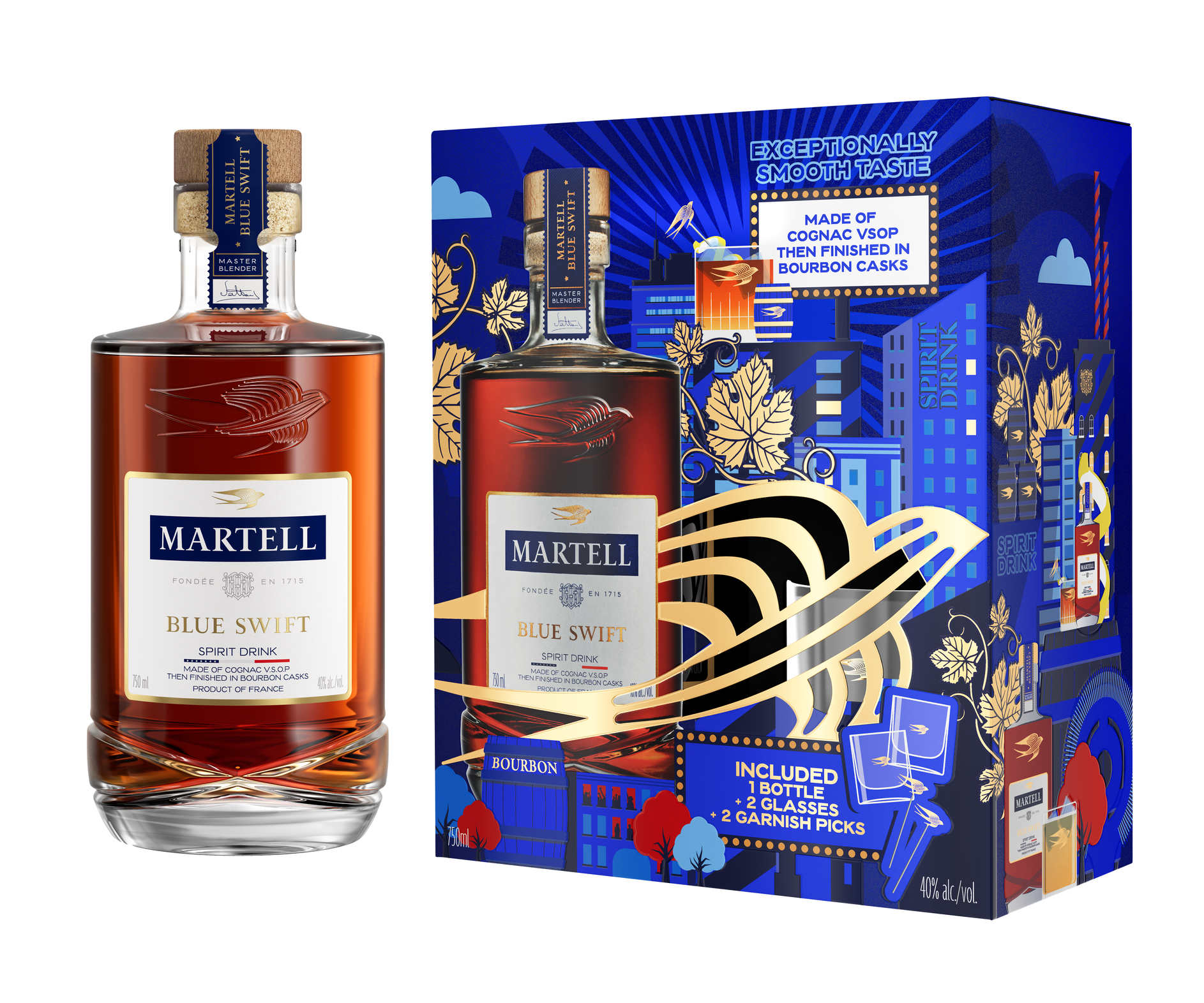 Martell defies expectations with an exceptionally smooth new gift set this holiday. The world’s first VSOP cognac finished in bourbon barrels, Martell Blue Swift is defined by its bold mixing of cultures and traditions. The new limited edition set gives nod to French cognac and American whiskey with a box adorned with vines and oak casks, reinforcing the art of mixing with a 750ml bottle of Blue Swift, glassware, garnish picks and cocktail inspiration.