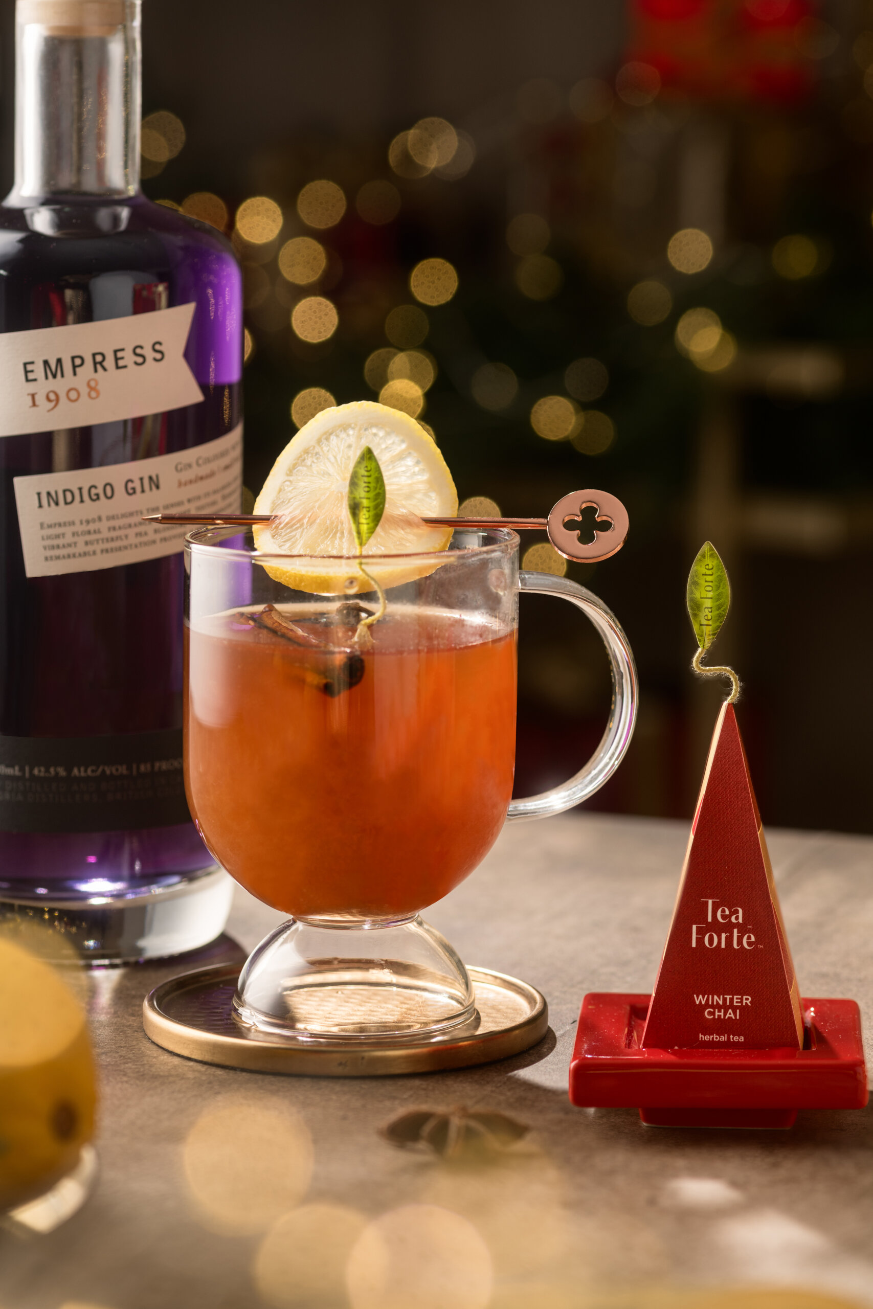 1. Brew the winter chai tea by placing the Tea Forte Winter Chai infuser in a hot toddy glass, and add hot water.