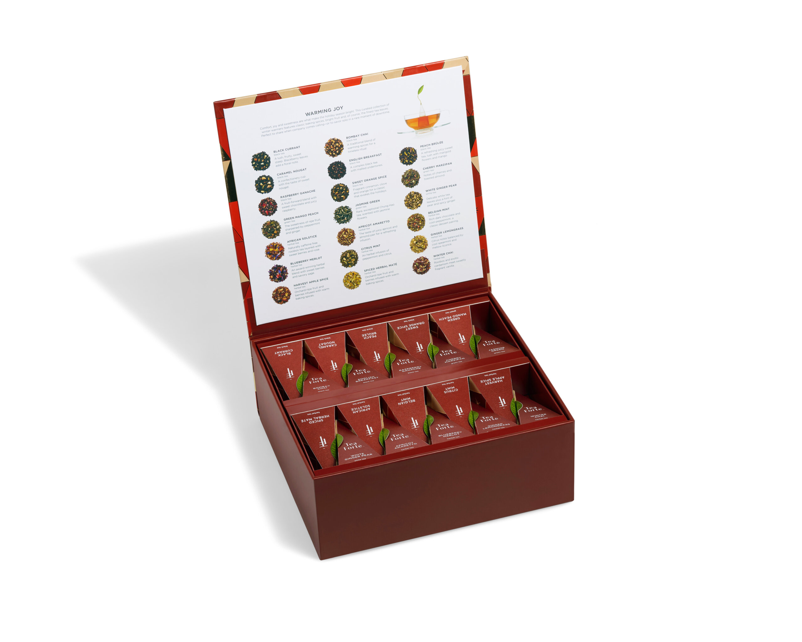 Ideal for tea lovers, Tea Forté’s acclaimed Warming Joy Tea Chest offers one of the largest holiday collections of 40 festive pyramid infusers, two of each blend, wrapped in their holiday best.The open lid reveals a detailed tasting menu offering a variety of tea types for everyone, including black, green, white and herbal teas, inviting the discovery of new favorites. This festive collection is the perfect assortment for holiday hosting and gifting to tea lovers