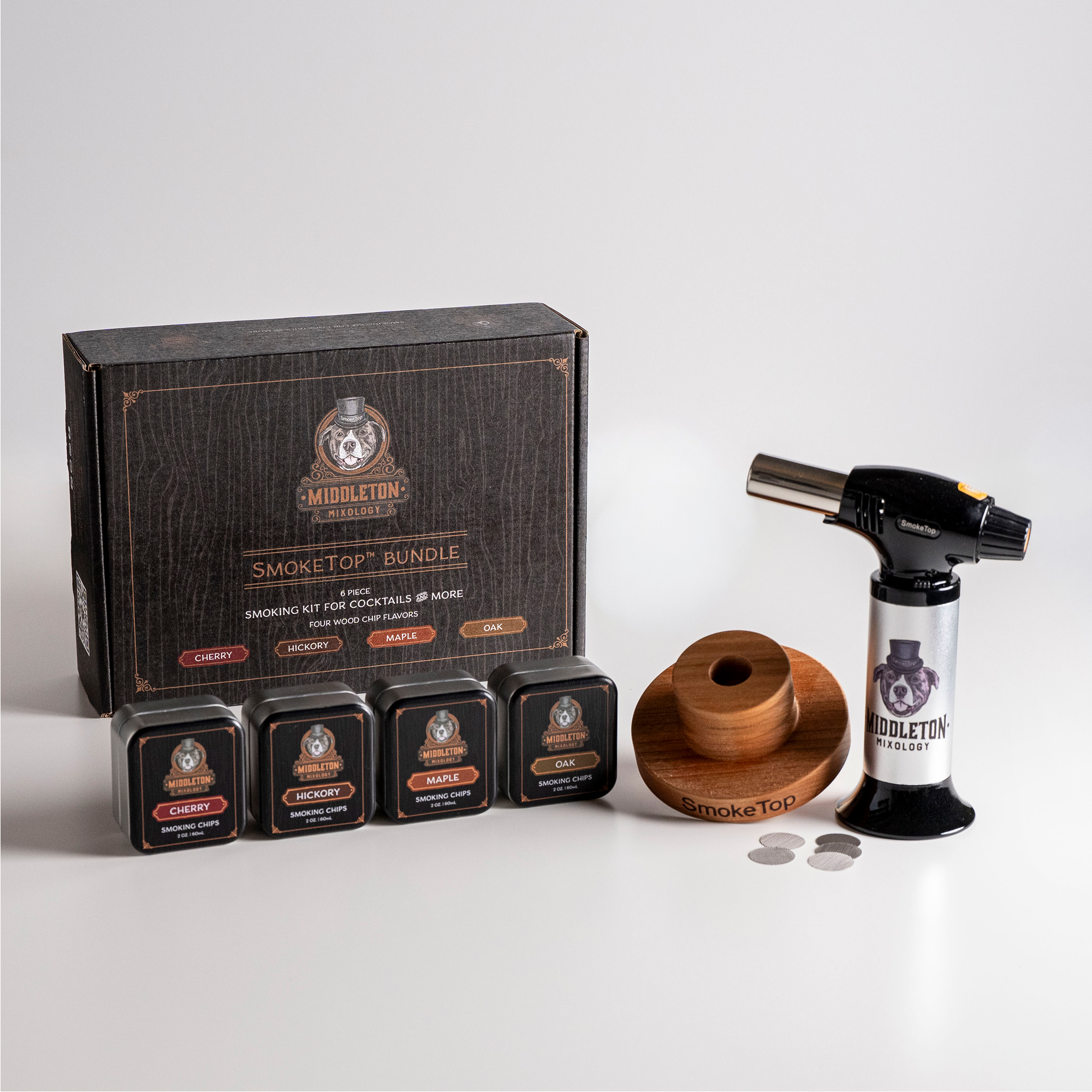 A bartender-designed smoking kit made in the USA, complete with wood chips, angled torch, fuel, and screens. Adds aromatic depth and dramatic flair to cocktails.