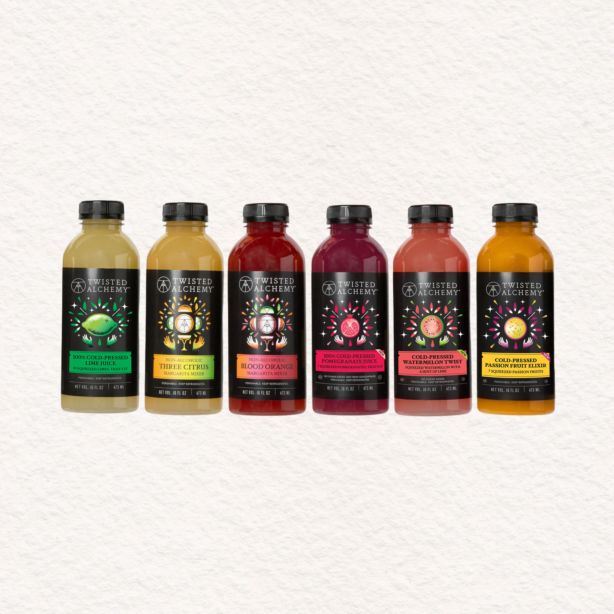 A premium six-bottle set of cold-pressed juices and mixers made for crafting cocktails or mocktails. Fresh, vibrant, and perfect for holiday entertaining.