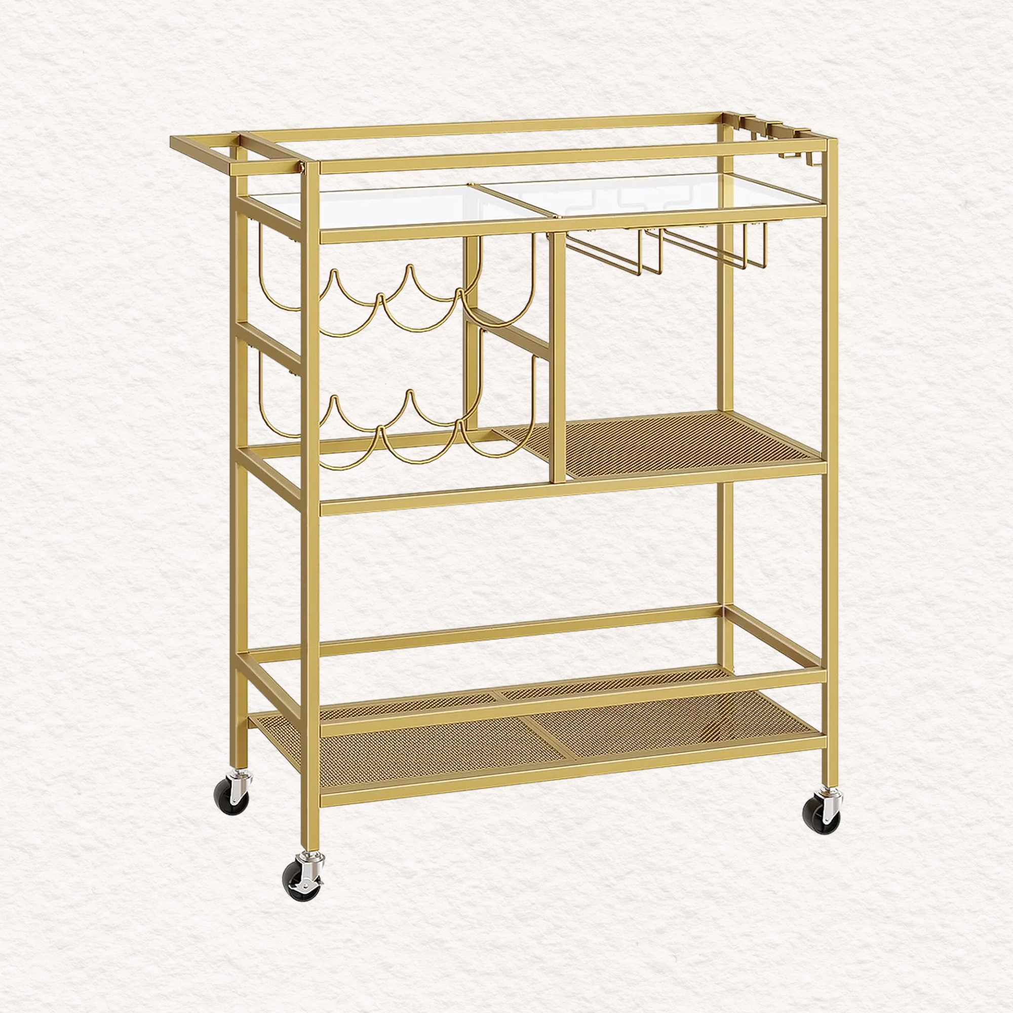 A stylish three-tier rolling bar cart with wine rack and glass holders. Functional, elegant, and perfect for creating a dedicated Valentine’s cocktail station.