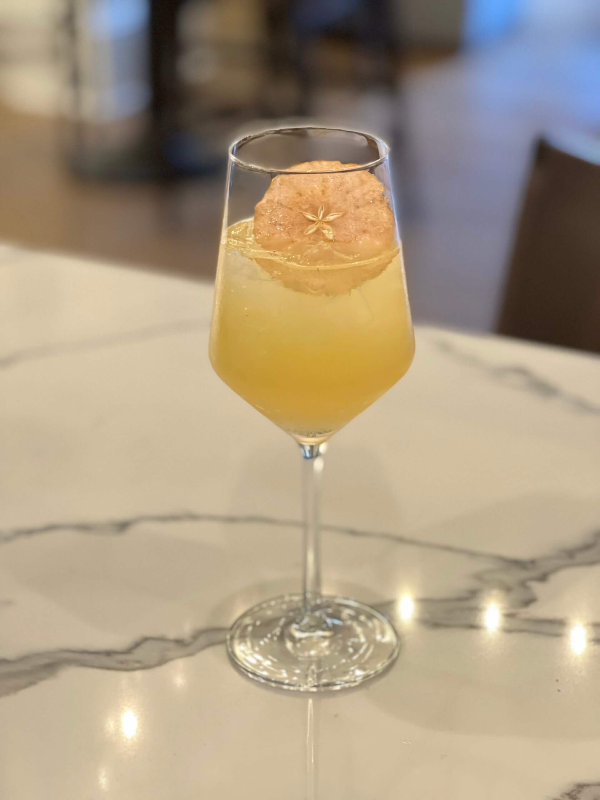 Preparation: build all ingredients into a wine glass with ice and stir for 5 seconds gently to combine – garnish with an apple chip to serve! Autumn Syrup recipe 20 oz brown sugar 3 cinnamon sticks 1/2 tsp ginger powder 1/4 tsp allspice powder 1 vanilla bean 8 oz orange juice 6 oz water – bring all ingredients to a boil – let cool then strain – keep in an airtight container and refrigerate until use