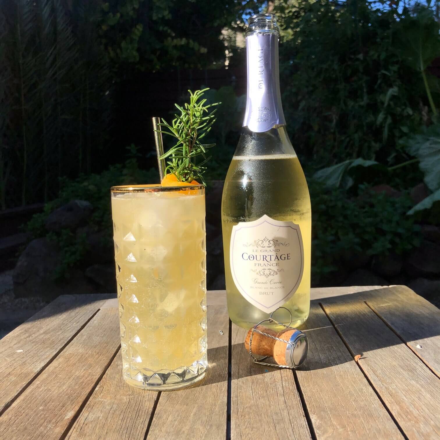 Preparation: Build all but Le Grand Courtâge into a shaker tin and shake thoroughly with ice. Pour 3 oz of Le Grand Courtâge Blanc de Blancs in a narrow collins or rocks glass and strain the tin into the glass to let mix. Fill with cracked or pebble ice and garnish with a dried apricot skewered with rosemary.