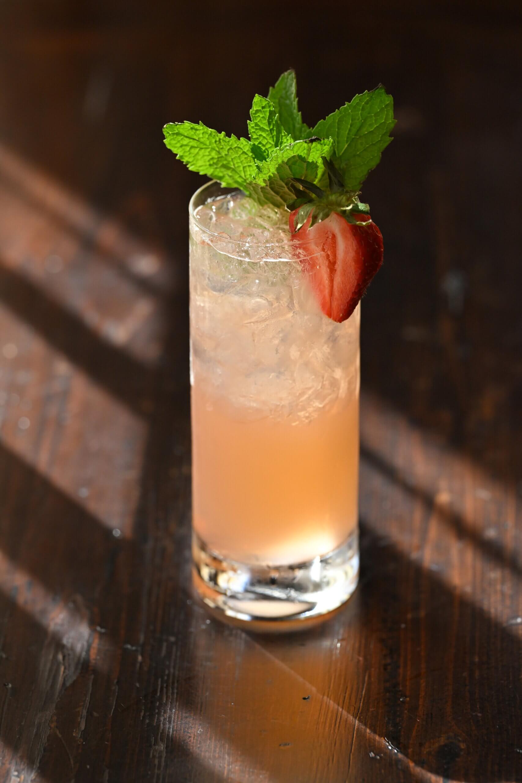 Preparation: Combine the Gin Sherry Cardamaro Lemon & Strawberry/Peppercorn Syrup into a tin and shake with ice until diluted. Strain into an empty collins glass. Fill with pebble ice. Then top with the sparkling Le Grand Courtage Blanc de Blanc Brut. Mound pebble ice. Then garnish with a strawberry slice and mint bouquet. To make the strawberry peppercorn syrup: – Combine 300g fresh cut strawberries and 20g of crushed pink peppercorns with 1000g of Simple Syrup in a vacuum-sealed bag. – Sous vide the contents at 135 degrees for 120 minutes. – Remove from sous vide and chill to room temperature. – Strain the mixture with a chinois or coffee filter. – Label date and refrigerate until needed for use. Stores for up to two weeks.