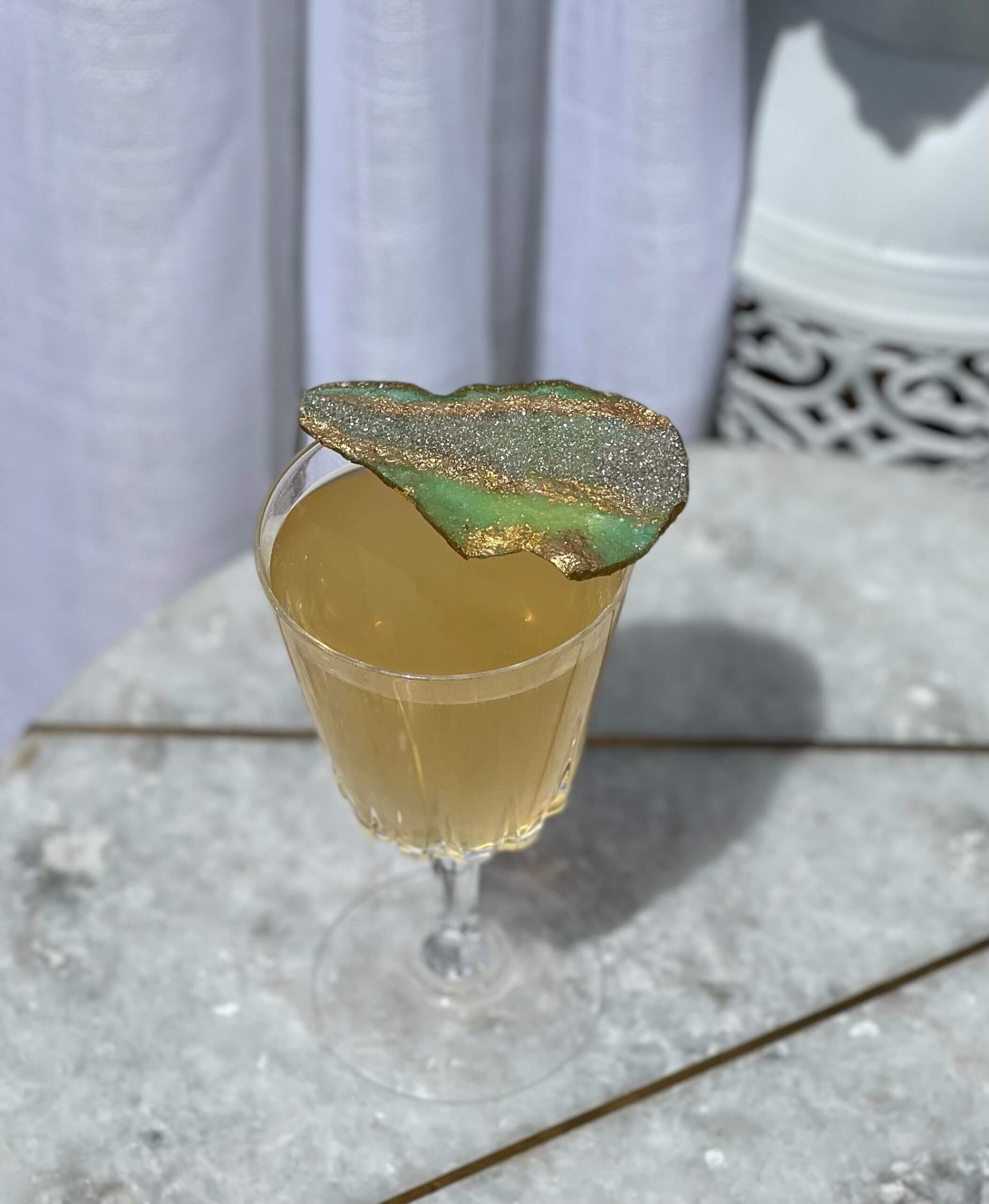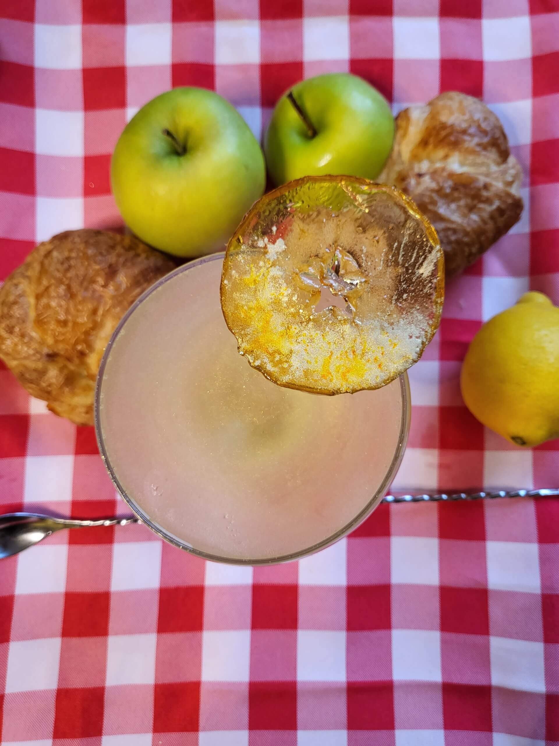 Preparation: put a small amount of edible cocktail glitter into champagne coupe prior to pouring cocktail in. Put all ingredients less champagne into a shaker and shake with plenty of ice. Strain into coupe and stir so that glitter swirls in glass. Top with champagne and lay glass apple gently on side of the glass. How to make homemade ingredients: *Salted butter croissant fat washed vodka: soak one buttery croissant (86 g) into 200g of vodka (I chose Grey Goose) and 1/2 tsp salt. Let sit for 90 minutes and then remove croissant from liquid and place vodka in freezer. Gently separate the fat solids and strain the remaining liquid through coffee filters to get the final product. *Green apple syrup: juice enough green Granny Smith apples to yield 168g. Mix that juice with .6g of citric acid. Blend that mixture at room temperature on high speed for 5 minutes with 336g of sugar. *Gliitered Gold Glass Apple garnish: slice green apple with a mandolin to 2.5 mm and place them in a lemon water bath. Then place slices on silpat on baking tray and place another tray on top. Bake in the oven for 25 minutes at 205°. Remove from heat and remove the top tray. Place back in the oven at reduced heat for 60 minutes more at 175°. Remove from oven and let sit for an hour. Make caramel syrup by combining 70g water and 200g sugar over heat in pot adding 5g vinegar and 37g glucose stirring until boiling begins. Monitor temperature with thermometer until it reaches 315° and then remove from heat. Dip slices of apple into syrup and lay flat to dry on silpat. Dust with glitter. I included my answer to live joyously answer here because there seems to be a glitch in the submission form. When I embarked upon creating this cocktail and thought about what it meant to “live joyously” I had to think about how I go about my life and what brings me joy on a daily basis. Most recently it’s been skating around this city my home the big apple! Especially through Times Square where the energy and glitz is undeniable even for native new Yorkers such as myself it electrifies my entire being. In order to capture the essence of the product I was going to showcase of course some R&D was needed so drinking of the champagne commenced and nothing is more joyous than getting to sip champagne in the name of research! I picked up the hints of green apple drawing the parallel to my home the big apple and then the warm rich brioche notes which led me to the croissant inspiration. Taking those flavors from the champagne and thinking of how the other ingredients would really round out the cocktail and showcase the champagne led me to what I consider gold in a glass cocktail(quite literally too) which I hope can be enjoyed by those drinking it as much as I enjoyed creating it!