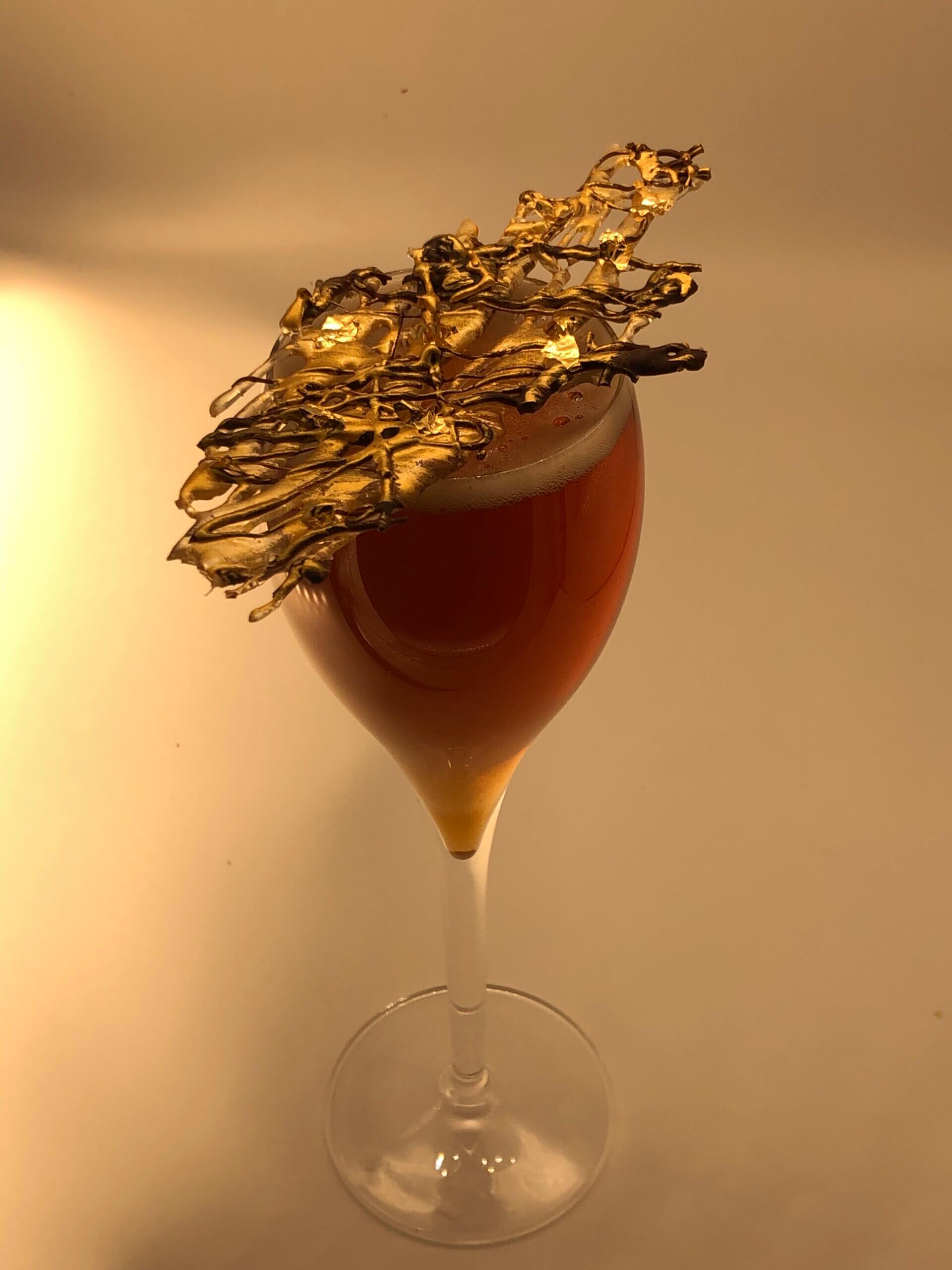 Preparation: Shake first 2 ingredients til well chilled with ice in shaker tin. Pour into 5 ounce champagne tulip glass. Top with Le Grand Courtage Brut. Garnish; Orange candy drizzle with dark chocolate edible gold paint and 24 karat gold leaf