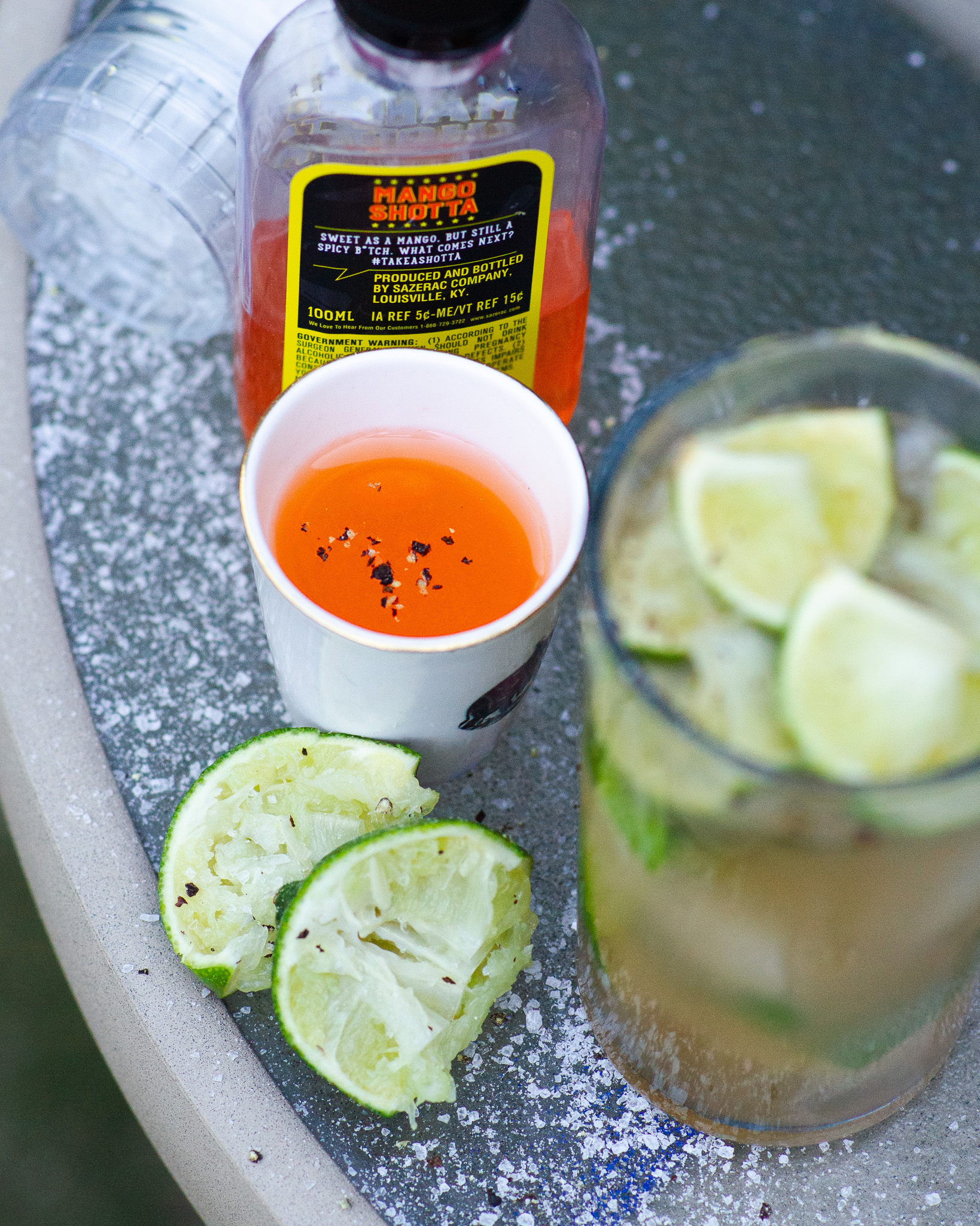 Juice the lime into a container and measure out .75oz of juice. Quarter the empty shells and throw them into the shaker with the lime juice, honey, and saline and lightly muddle all together. Add the rest of the ingredients briefly, but vigorously shake the ingredients. Dump into a short collins glass or a rocks glass. Crack a little salt over top. This drink is meant to be on the tart side but if it is too sour, order a Boquita and dump it in for complete balance.