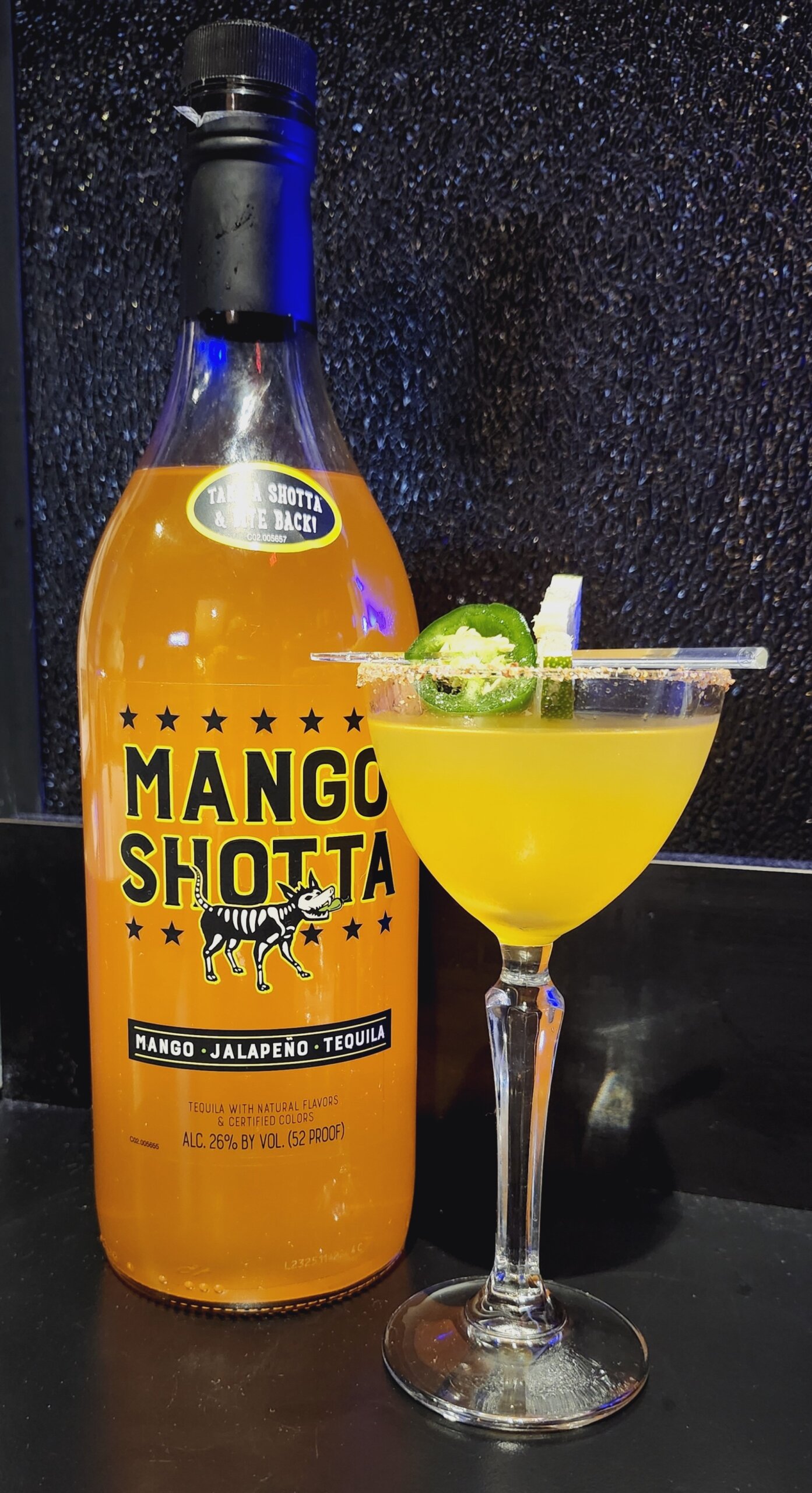 rim with chamay mango salt and a dried chili mango with 2 slices of jalapeño