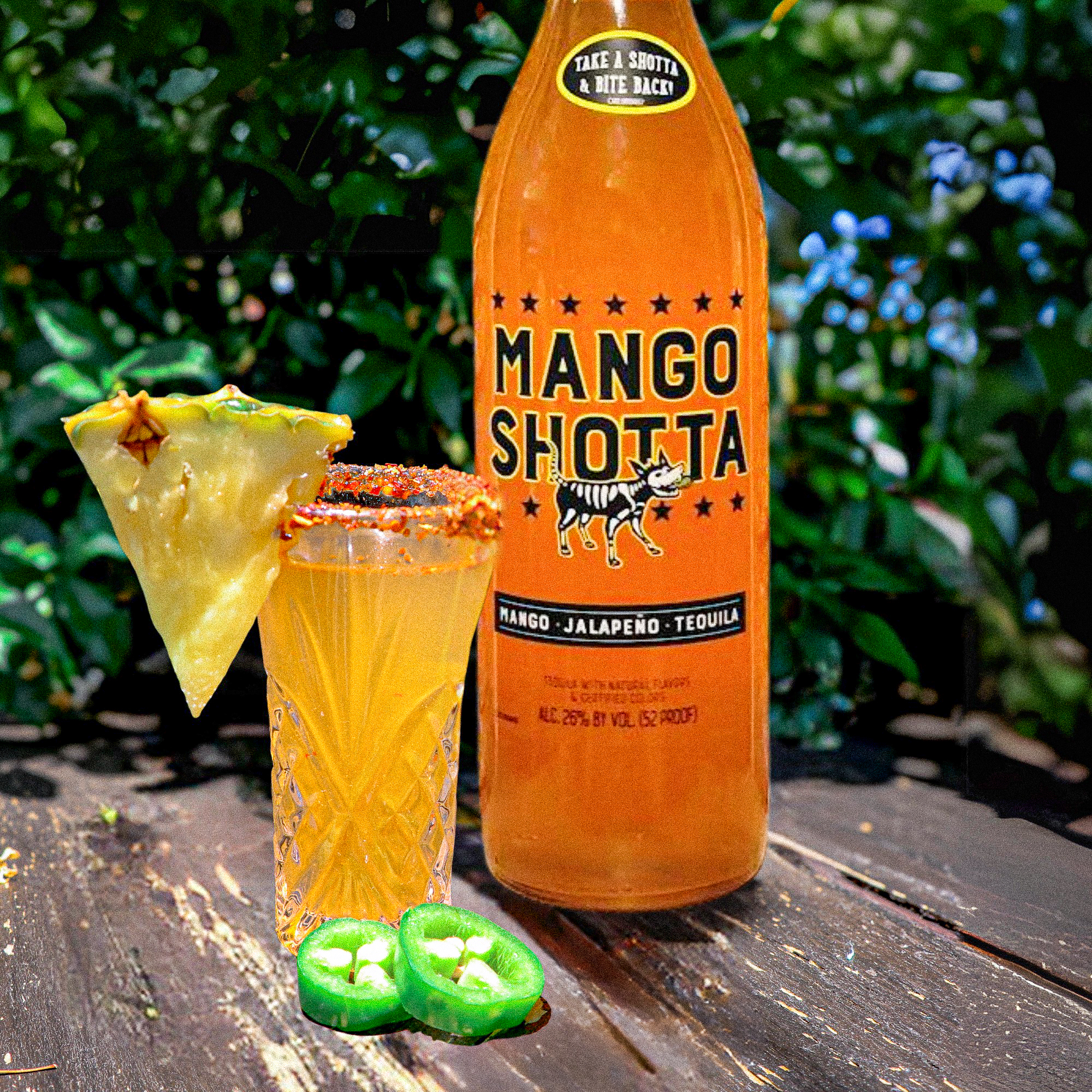 Chamoy and Tajin rim with mango chili lollipop, lemon wheel, and jalapeño slice
