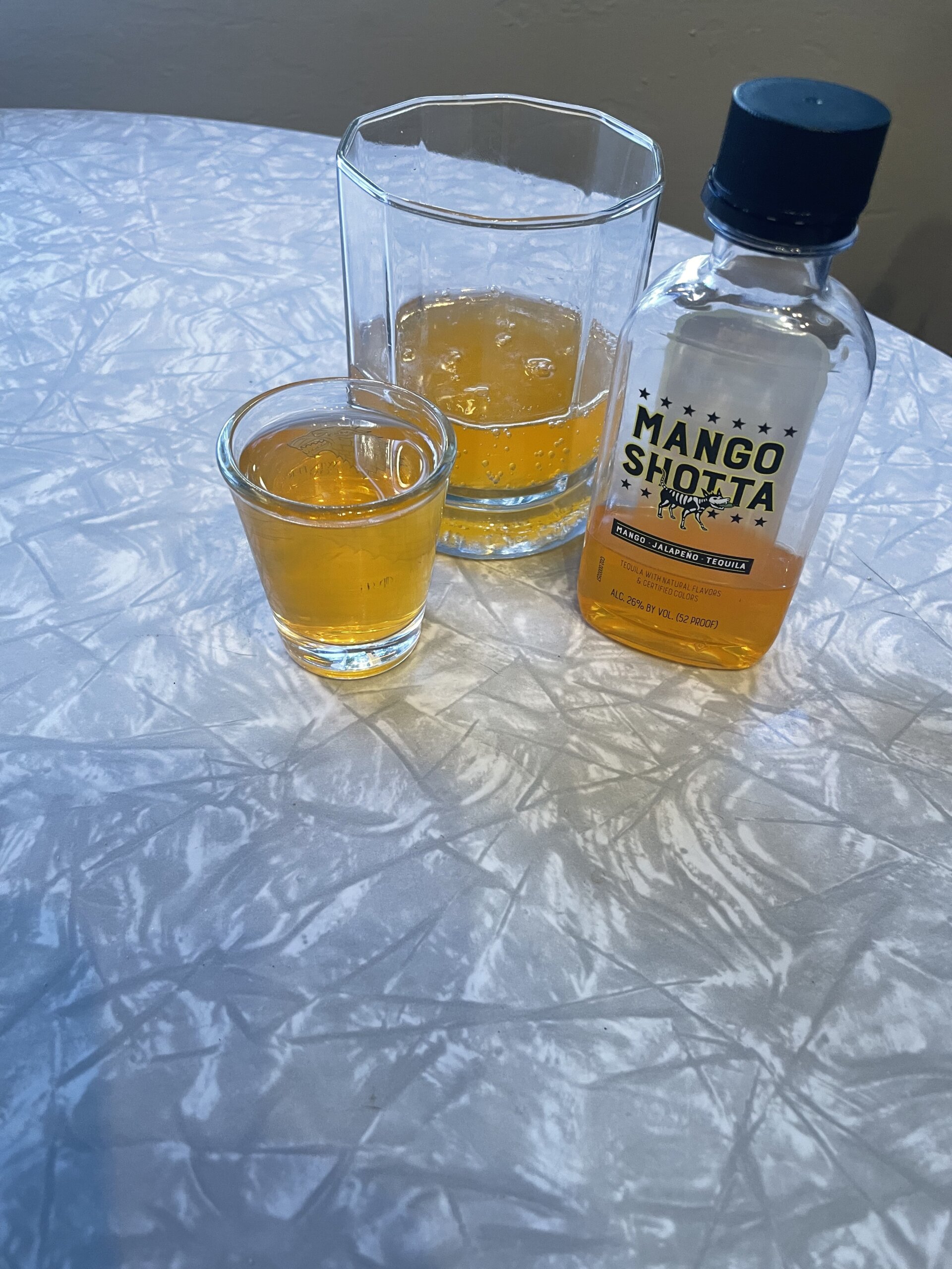 Pour tequila and Mango shotta into a shot glass. Pour soda in a separate glass.