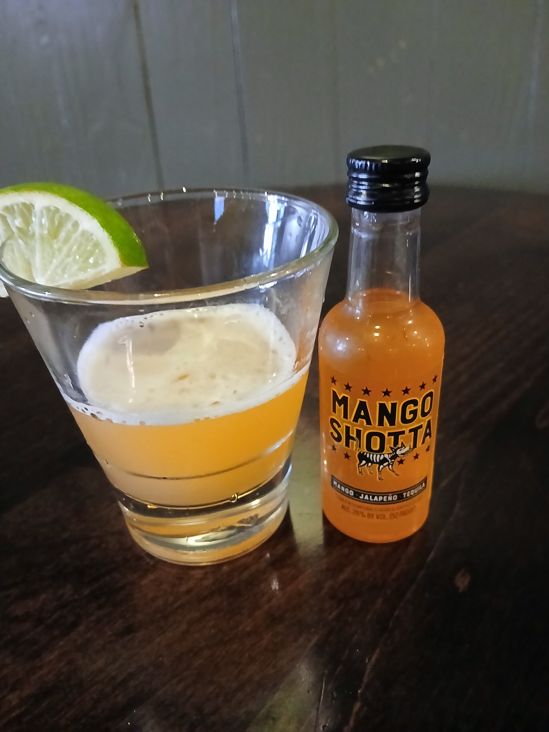 Place 1oz mango shortage,1/2oz lime juice,and 1/2oz simple in shaker tin place small handful of mint in tin