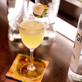 Lightly muddle the avocado in a cocktail tin, and then add the rest of your ingredients. Top with ice, and shake vigorously for 20 seconds to break down the avocado, and create a creamy texture. Fine strain into a stemmed cocktail glass, and garnish with a lemon wheel, and a flower.